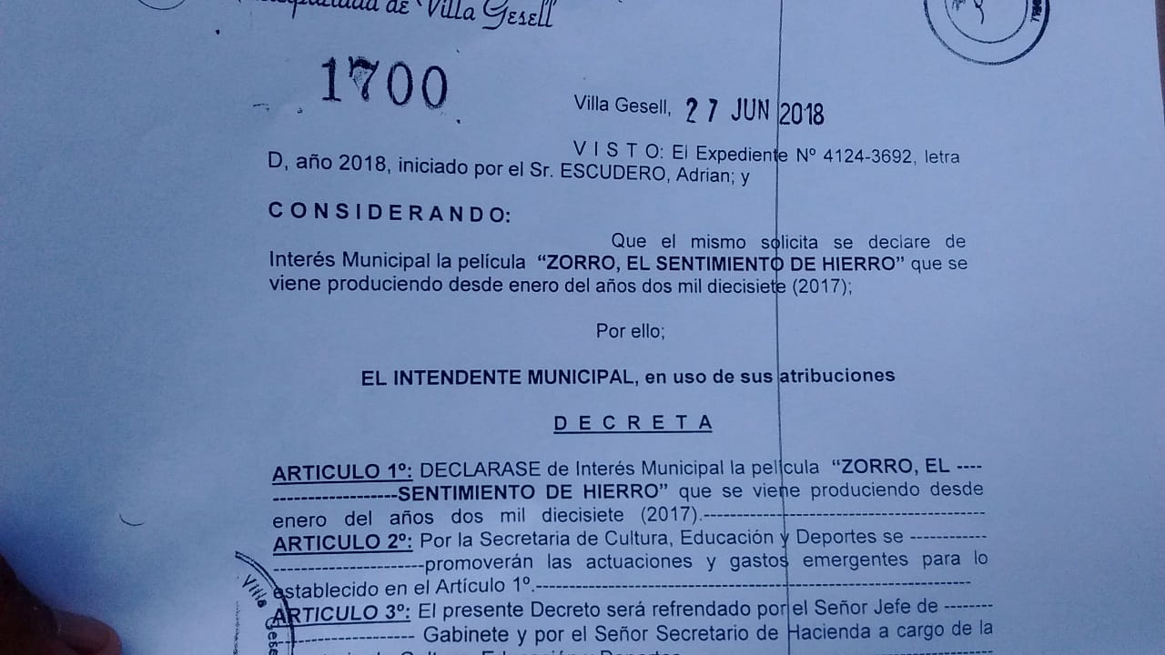 Si bien el rodaje se realiza en diferentes escenarios de nuestro país, gran parte del mismo tiene como epicentro la Ciudad de Villa Gesell, principalmente el Paseo del Pueblo Español, por ello, gracias a la gestión iniciada por el Dr. Alex Steverlynck, el intendente Municipal dio curso al pedido y a través de la firma del decreto N° 1700/18 la futura película, que es dirigida por Adrian Escudero Tanús, ostenta el honor de ser un eslabón importante en la Cultura Nacional.
