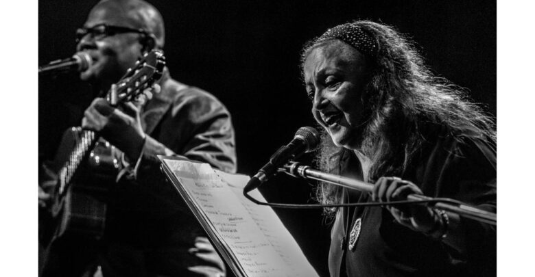 La cita fue en el Teatro Devoto, donde la artista compartió escenarios con músicos locales y fue acompañada en guitarra por Dorivaldo Santos.