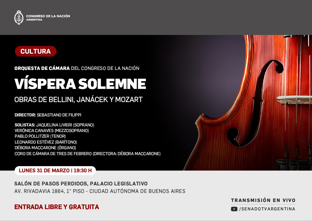 El concierto tendrá lugar en el Salón de Pasos Perdidos (Avenida Rivadavia 1864, 1º piso –C.A.B.A.), el lunes 31 de marzo, a las 19:30 horas, con entrada libre y gratuita. En esta oportunidad el director será el titular del organismo, el maestro Sebastiano De Filippi, y el repertorio estará integrado por obras de Bellini -al cumplirse 190 años de su fallecimiento-, Janácek y Mozart.