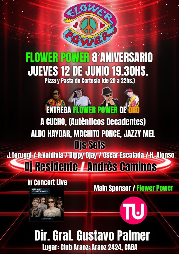 La programación es una postal en movimiento: habrá pizza y pasta de cortesía entre las 20 y las 22, como en aquellas previas que empezaban con hambre y terminaban con abrazos. Se entregará el reconocimiento Flower Power de Oro, destinado a figuras que marcaron época: Cucho Parisi de los Auténticos Decadentes, Aldo Haydar, Machito Ponce y Jazzy Mel. Nombres que nos remiten a pistas que ardían de verdad, a radios que hablaban distinto y a una Buenos Aires que todavía creía en el poder del beat.