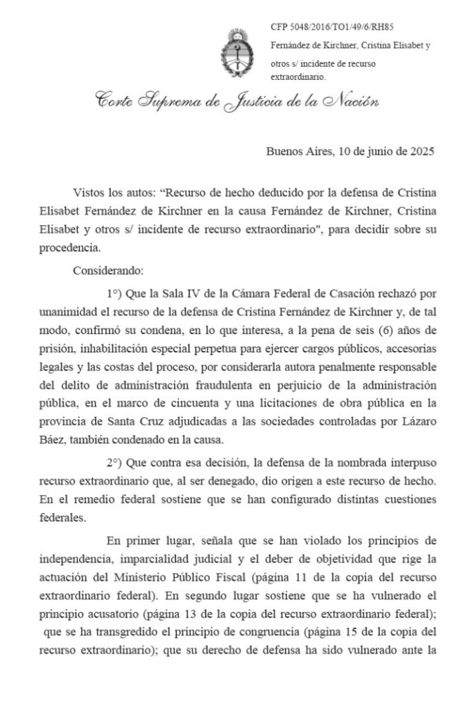 La Corte Suprema, integrada por Rosatti, Rosenkrantz y Lorenzetti, no encontró fundamentos válidos en los recursos de su defensa. Rechazó el reclamo, validó la sentencia, desestimó el alegato de persecución. La defensa había señalado parcialidad del tribunal, fallas en la valoración de pruebas y arbitrariedades. La Corte dijo que no.