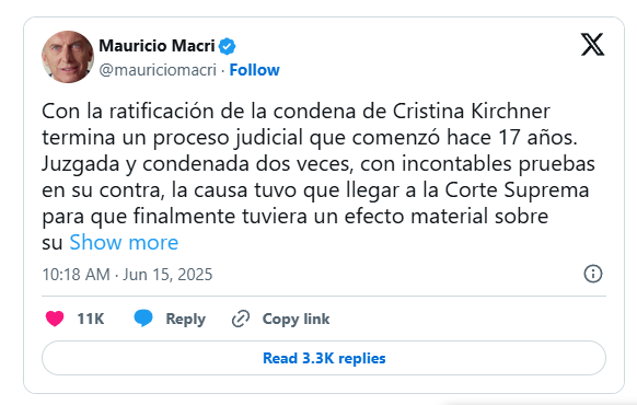 “Termina un proceso judicial que comenzó hace 17 años”, escribió Macri, al tiempo que destacó que la exmandataria fue “juzgada y condenada dos veces, con incontables pruebas en su contra”. En ese sentido, remarcó que recién con la intervención de la Corte Suprema “el caso tuvo un efecto material sobre su libertad”.